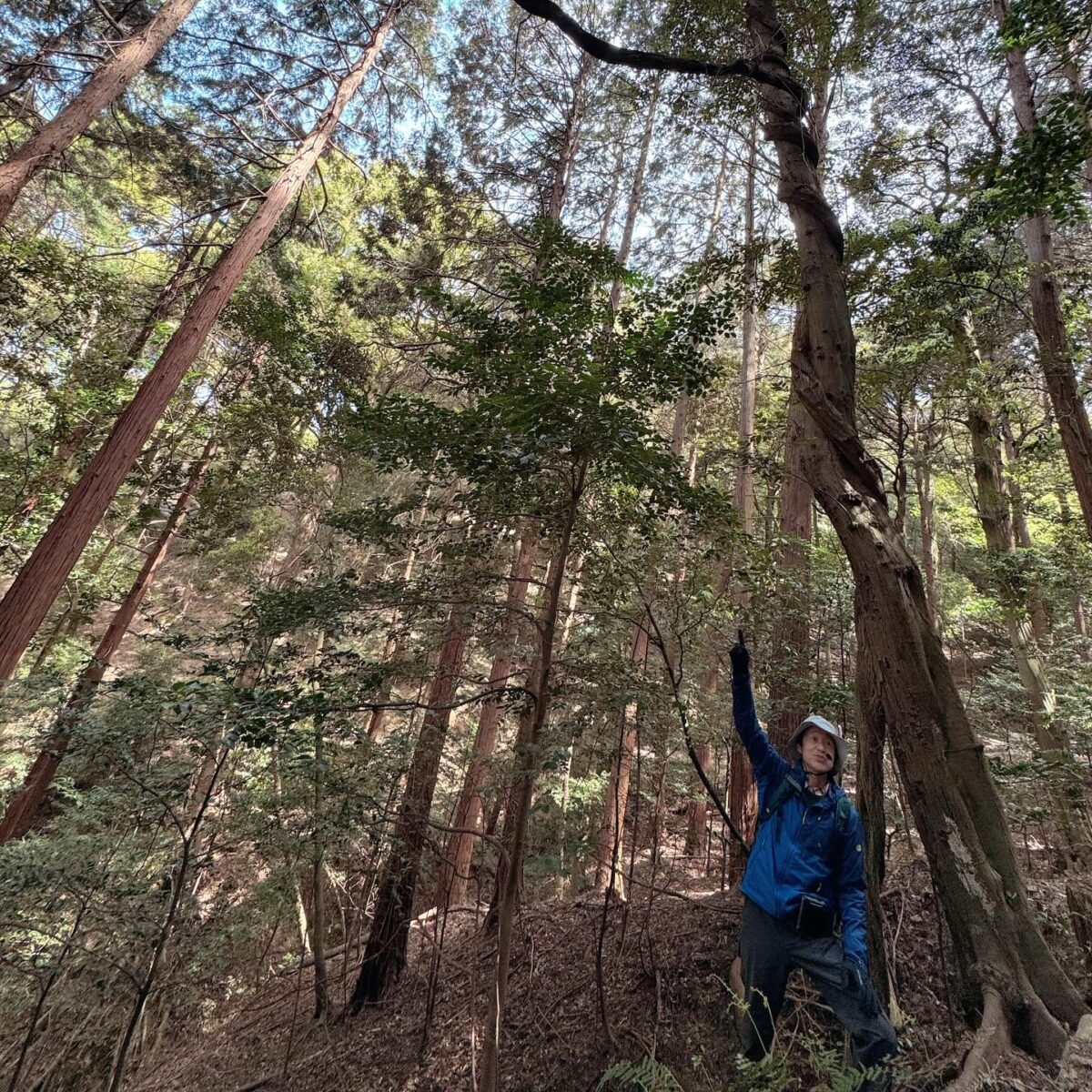 山桜の花びらやたくましい藤蔓に圧倒される森です。