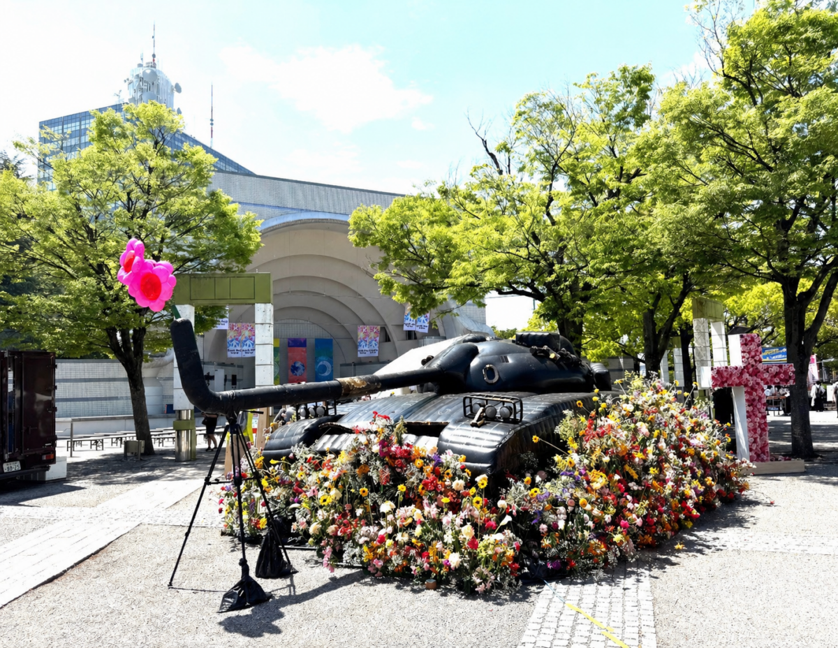 武器に花を挿し、“破壊の象徴”を“祈りの象徴”へと転換するインスタレーションを展開します。