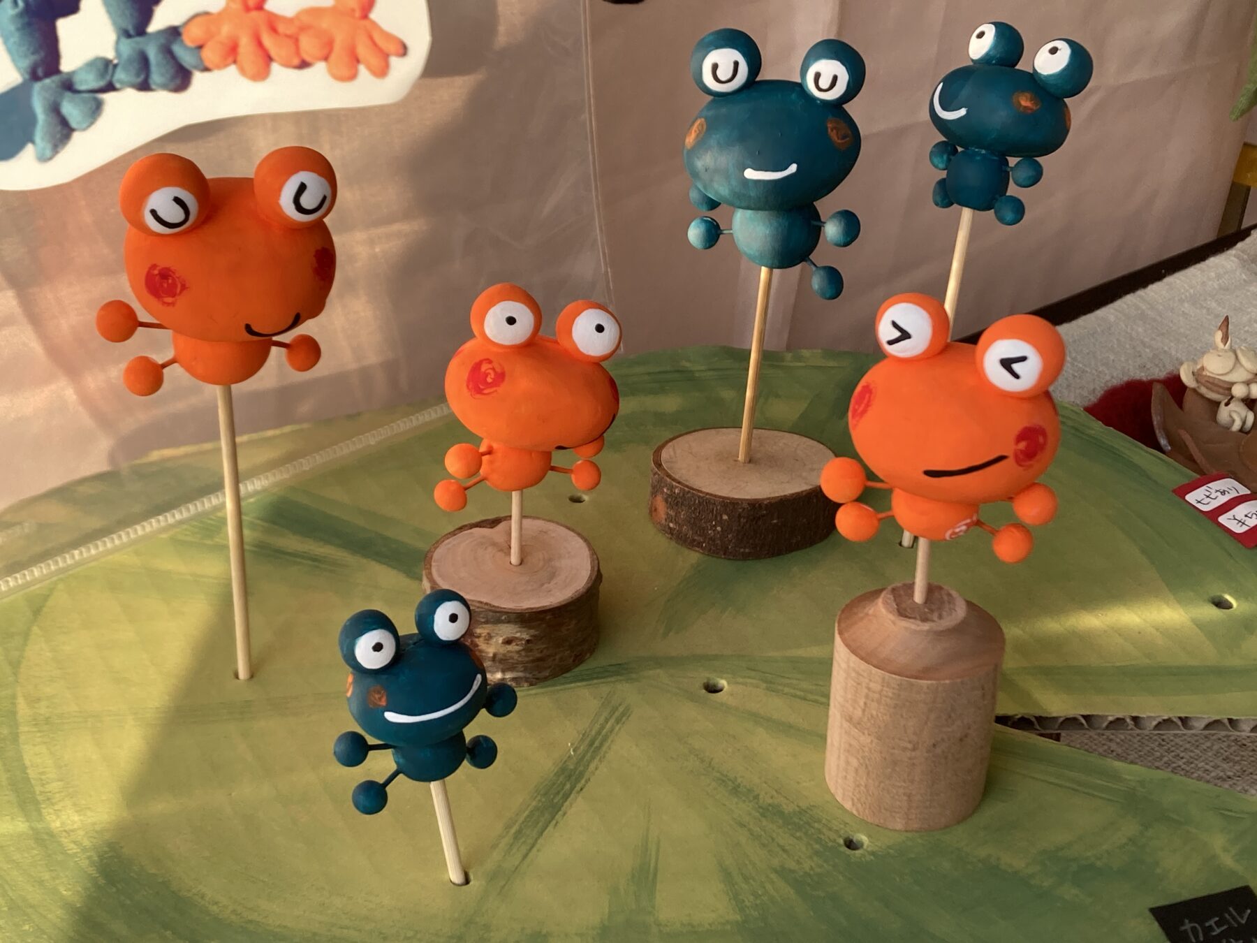 木くずを丸めて作った「だるま」「かえる」。土や粘土でつくった置物やストラップ、手描きTシャツ、エコバック、かえる帽子など。