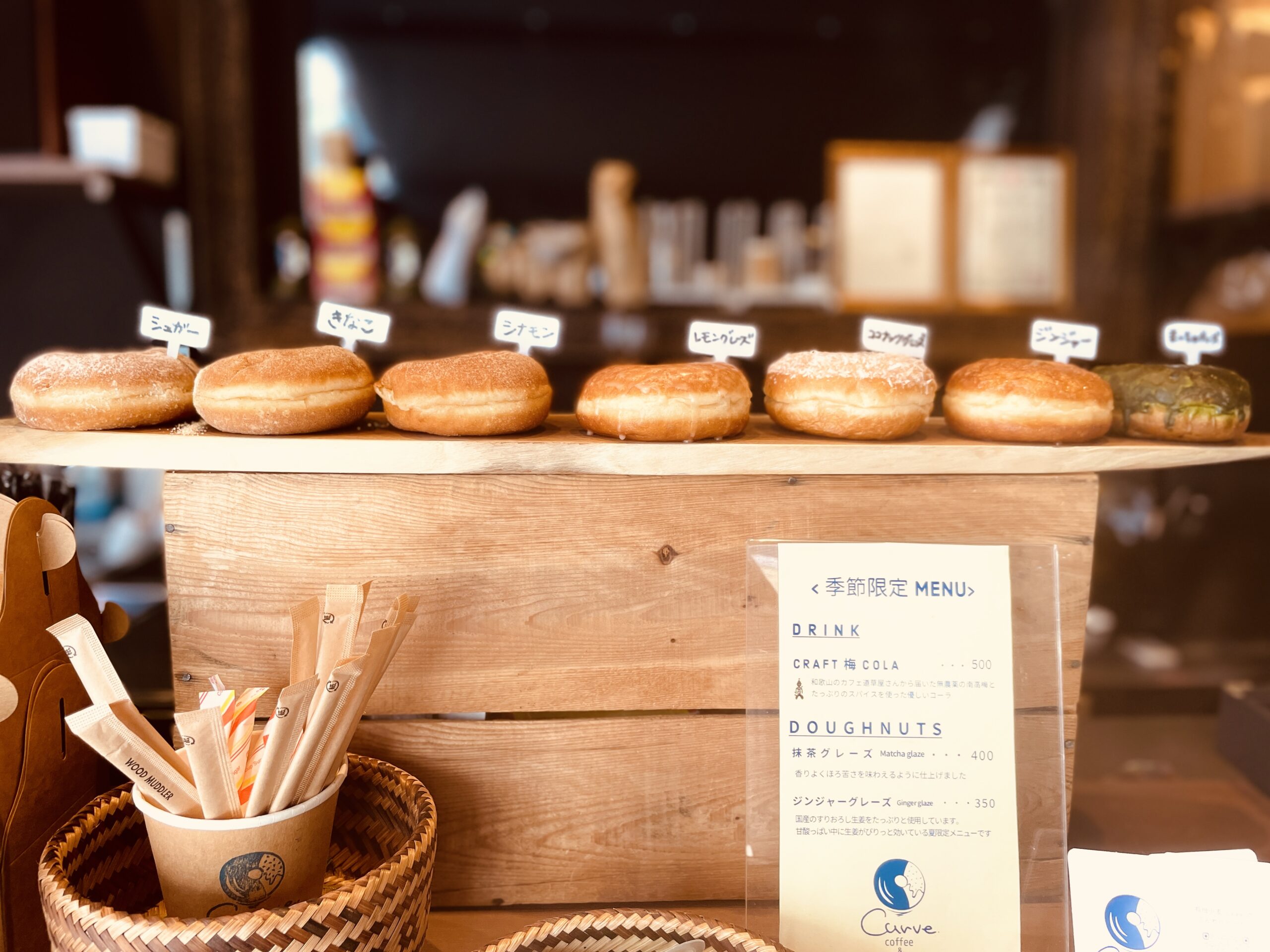 国産有機小麦のふんわりドーナツ(6-7種)、国産レモンのレモネード、オリジナルブランドコーヒーなど、ドリンク類