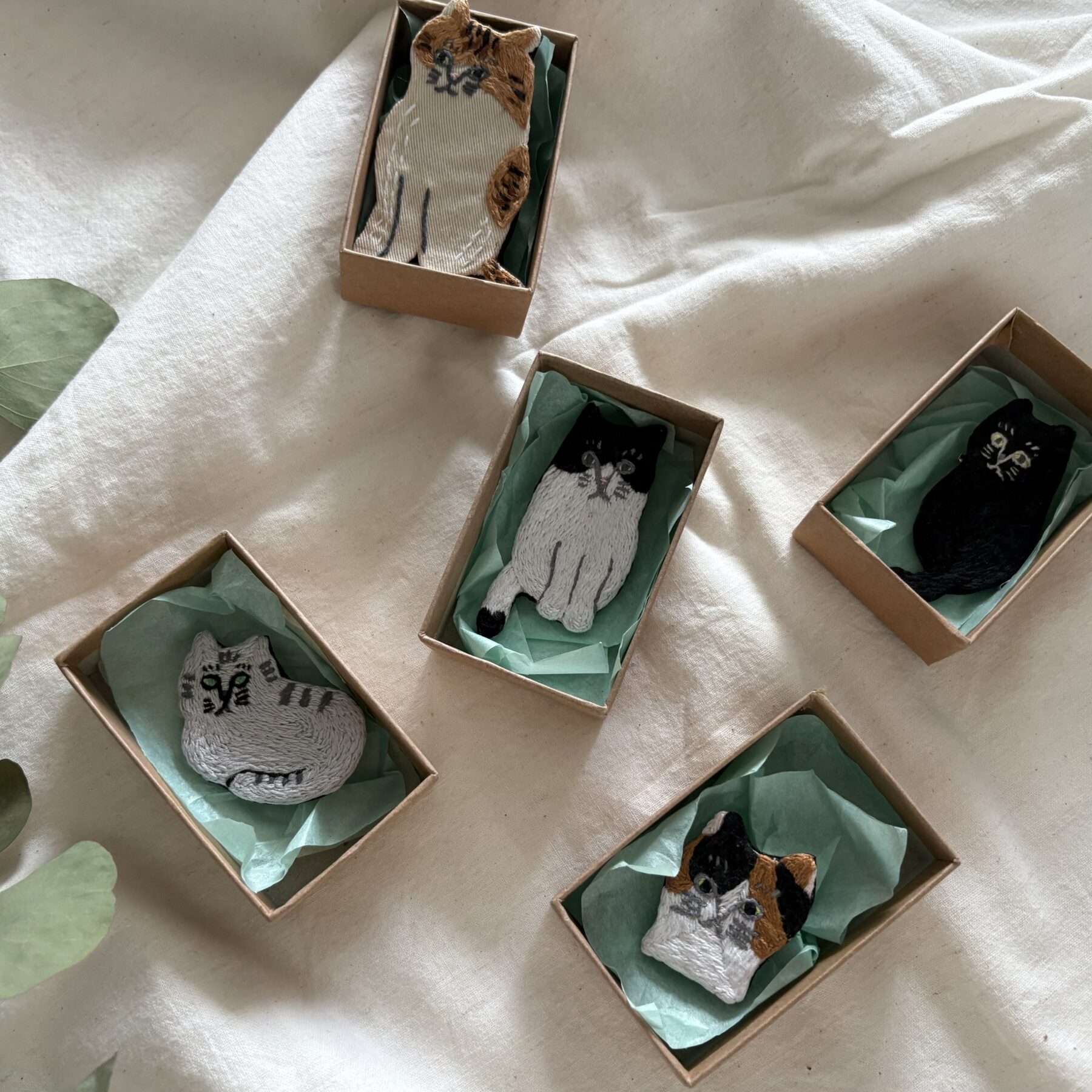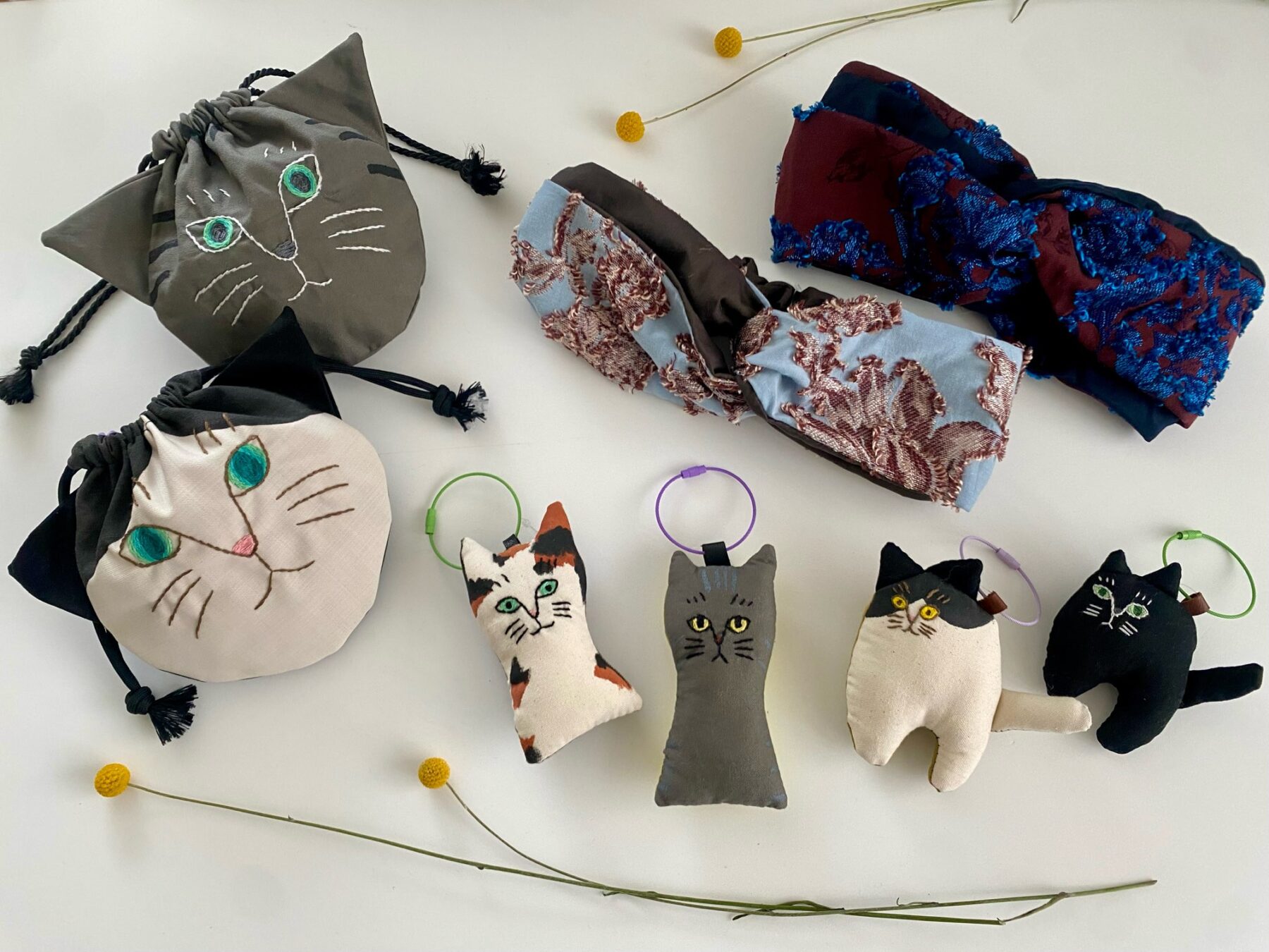 ヘアアクセサリー(ヘアターバンやヘアピンなど)と猫モチーフの刺繍雑貨(ポーチ、巾着、バック、キーホルダー、ブローチなど)