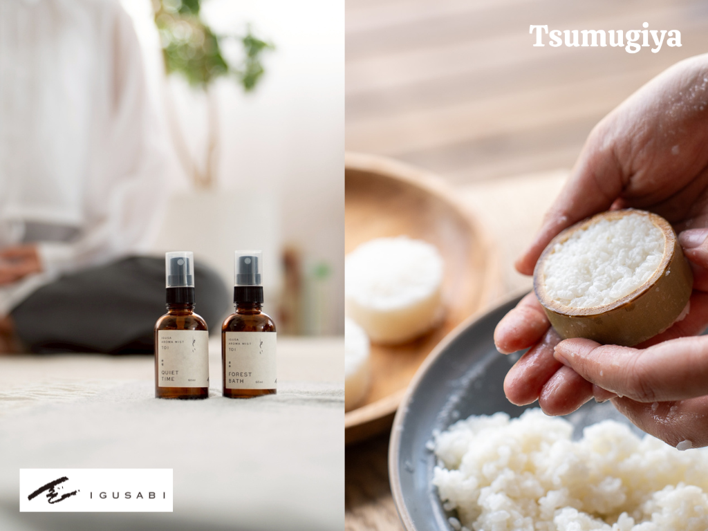 IGUSABI:国内生産の9割を担う一大産地、熊本県八代市のい草。その中でも貴重な無農薬のいぐさを、香りや味として五感で楽しめる体験にしてお届けします。 Tsumugiya:長野県産のお米と味噌を使い、オリジナルのくるみ味噌だれを炭火で2度焼き。香ばしい香りとともに、なつかしさを感じる味をお届けします。