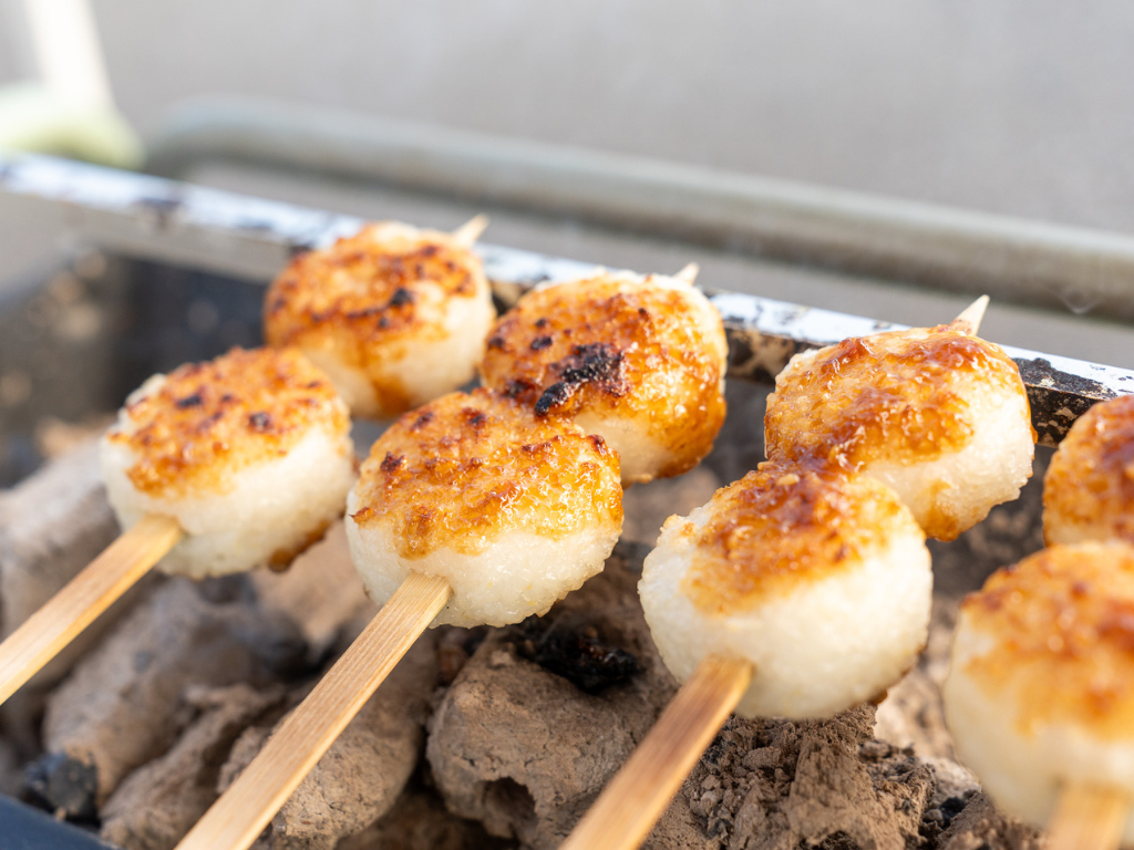 いぐさパウダーをつかった【カフェドリンク】/お部屋が癒しの空間になる【いぐさアロマミスト】/炭火でこんがり、あまいくるみ味噌たっぷりの【五平餅】をご提供します。