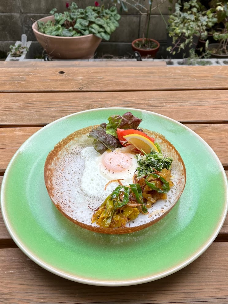 スリランカカレー、ホッパー、ミルクティーです。カレーはベジタリアンに対応しています。またスリランカの有機栽培紅茶、リサイクルサリーの小物なども販売いたします。