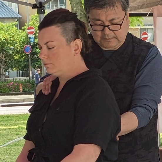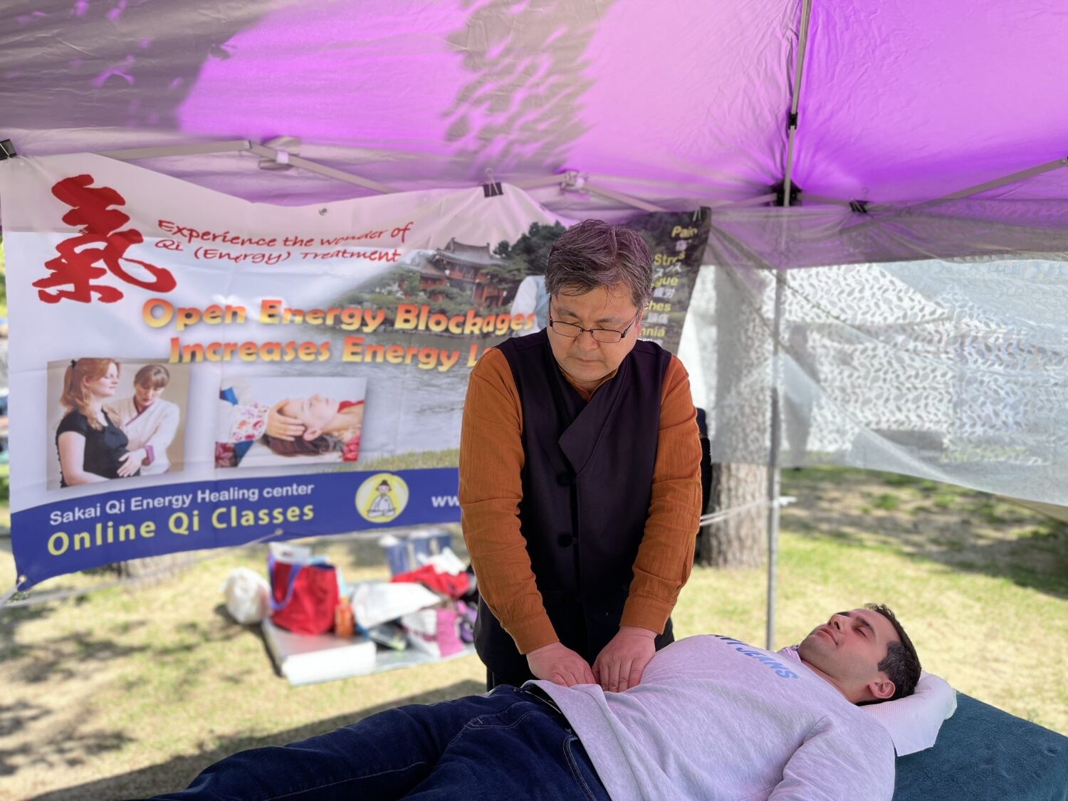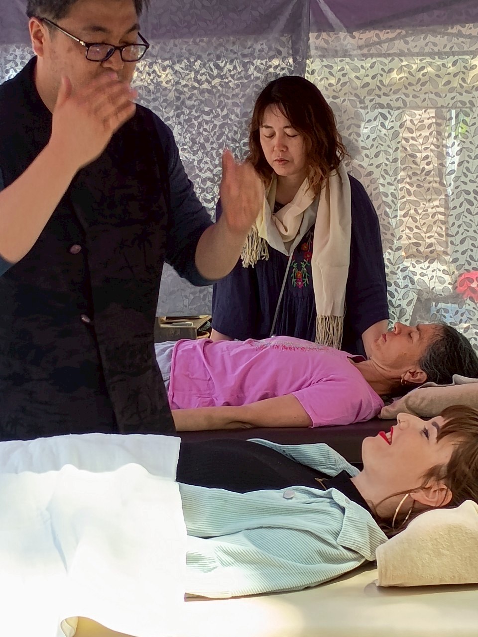 氣ヒーリング施術体験。氣マスターが軽くツボを刺激しながら、氣を補い・氣の流れを整え、心身のバランスを整えます。ベッドに横になって受ける、身体に負担のかからない施術です。