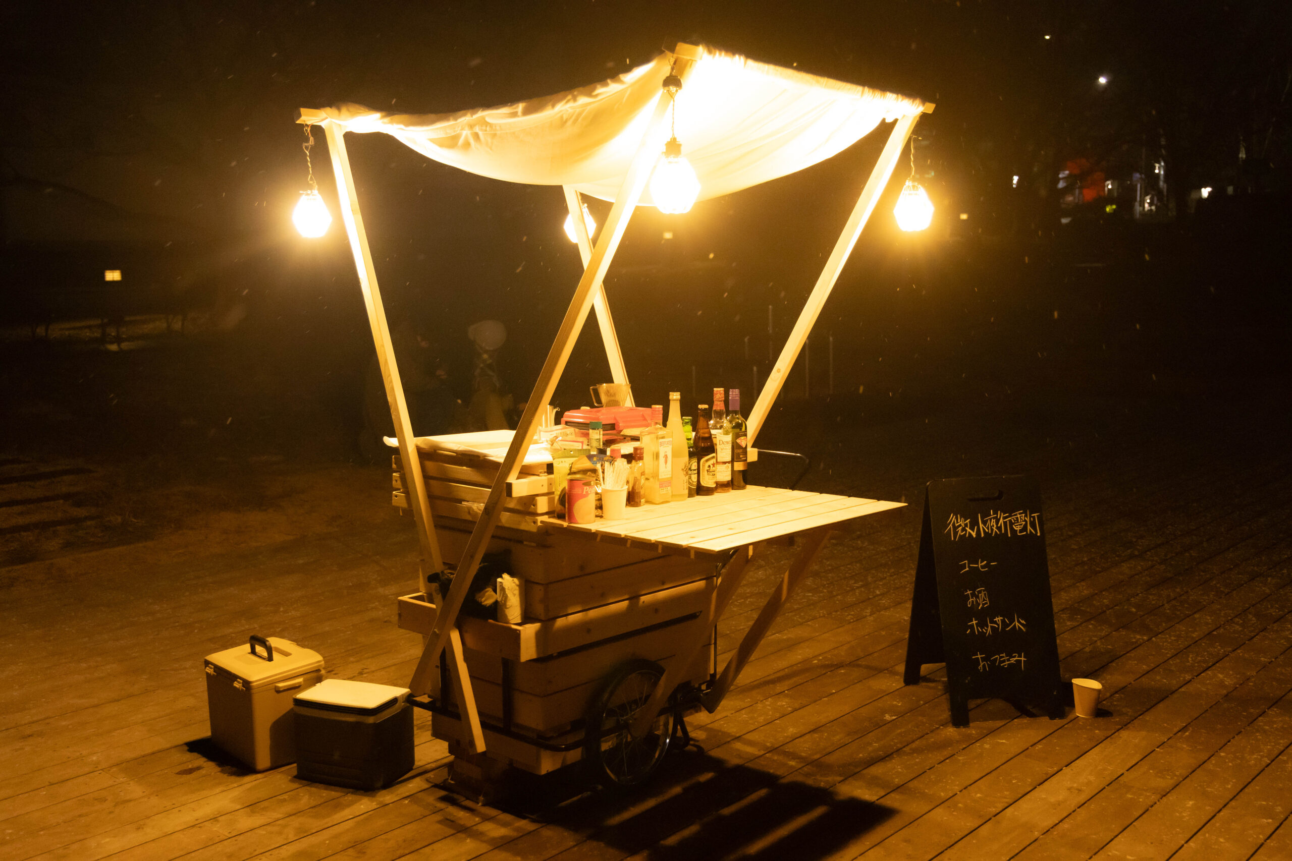 賑やかなイベントの合間に、ふらりと羽を休めにいらっしゃいませんか。手作りの屋台が灯す明かりの下、温かいサンドと飲み物をご用意してお待ちしております。他人のようで他人でない、不思議な安心感の中で、しっぽりしていきませんか?