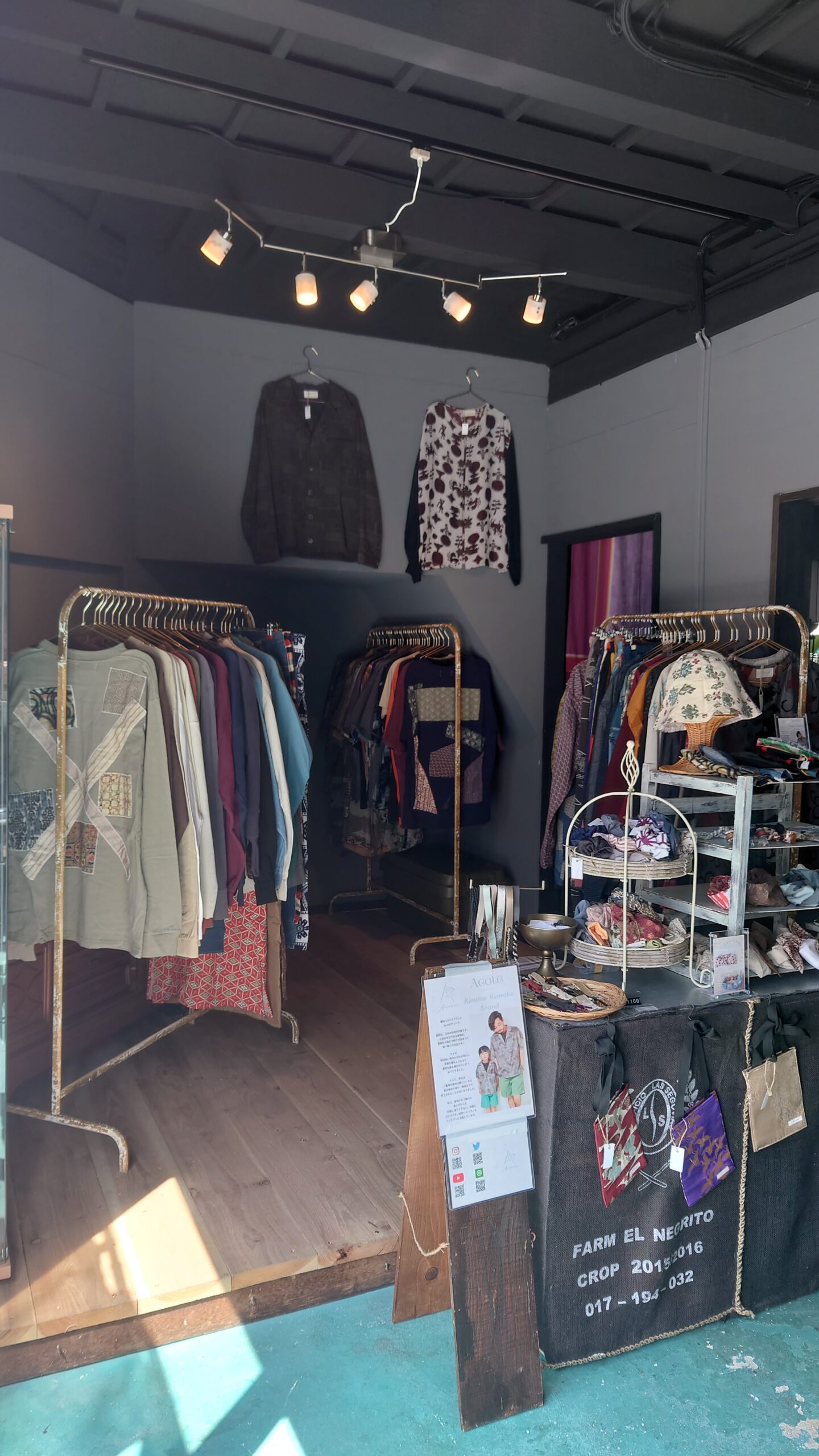 着物リメイクのアロハシャツやワンピース、古着とミックスさせて洋服、コインケースなどの服飾小物