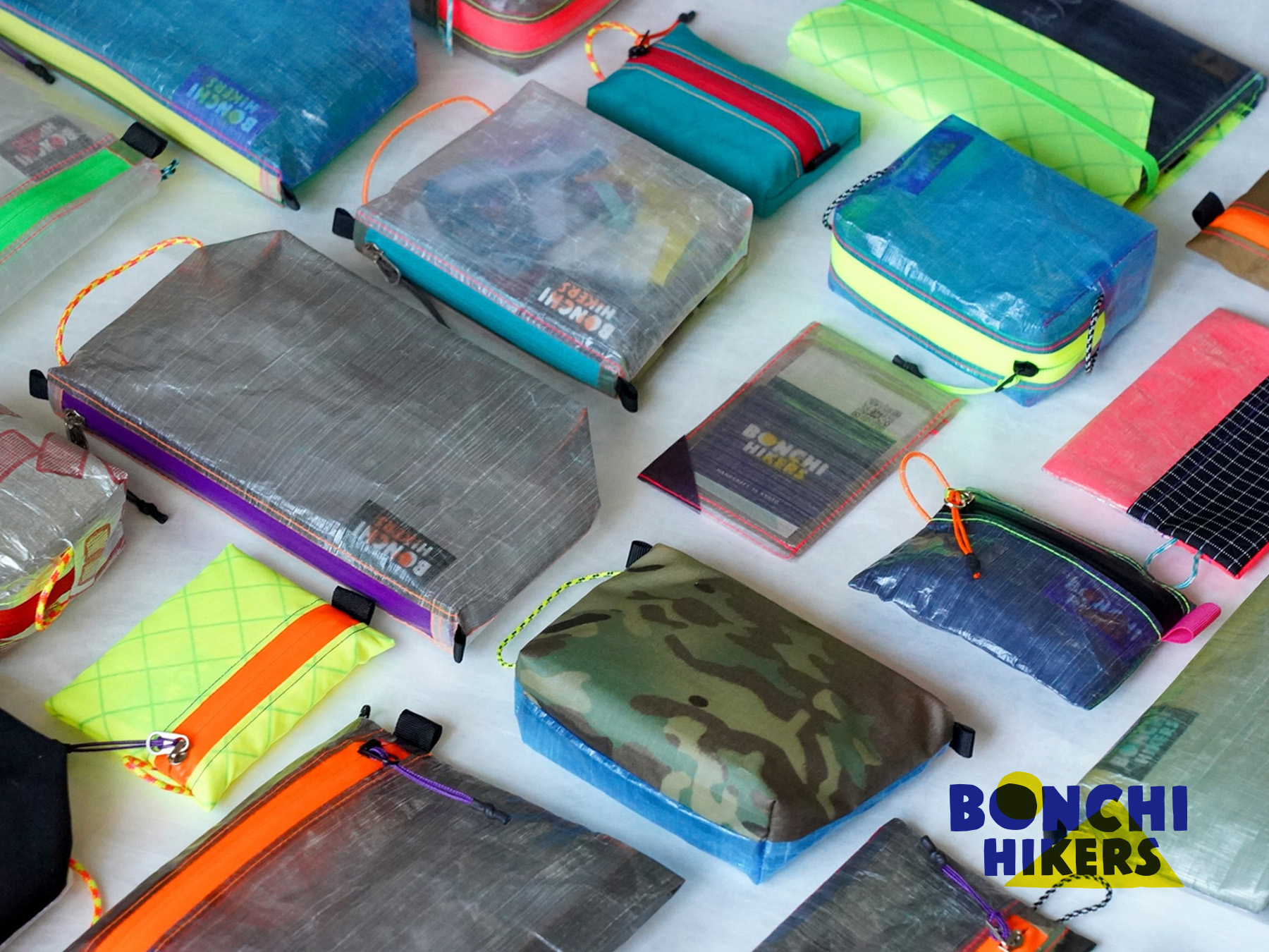 私たちは山と街が身近にある京都で、 山歩きでも日常でも使える、 軽くて丈夫な入れものを作っています。 空での役割を終えたパラグライダーをアップサイクルしたプロダクトやDCFポーチのほか、 使い終わったアウトドア製品の生地などを組み合わせたカラフルなアイテムもお持ちします。 軽い / 丈夫 / 速乾といった優れた機能性を持つ、 一点ものの色合わせをぜひ手に取ってお楽しみください。