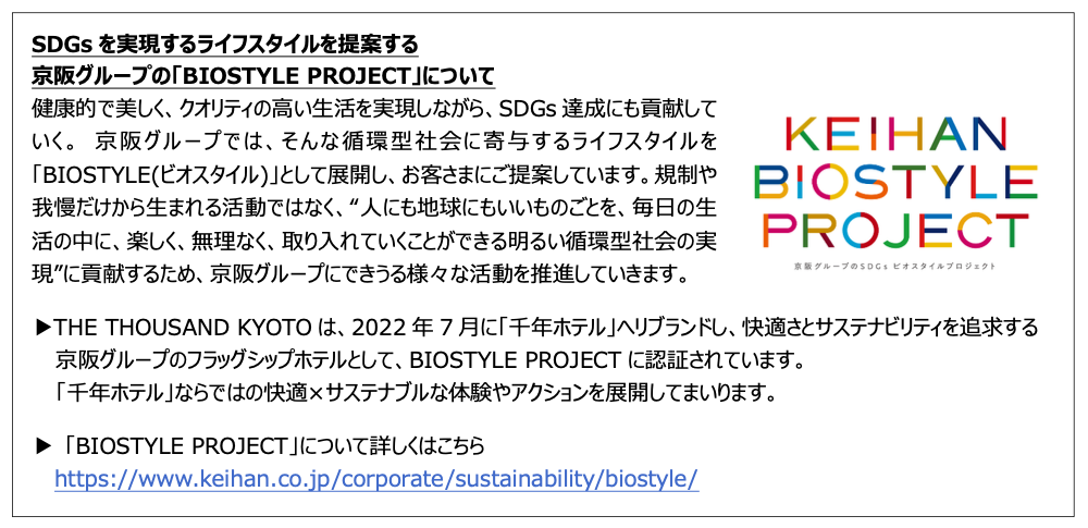 ザ・サウザンド京都は、“千年先に続く心地よさを追求する”京都駅前の「千年ホテル」として以下のアース デイアクションを実施し、お客さまとともに地球にやさしい持続可能な選択について考える 5 日間といたします。